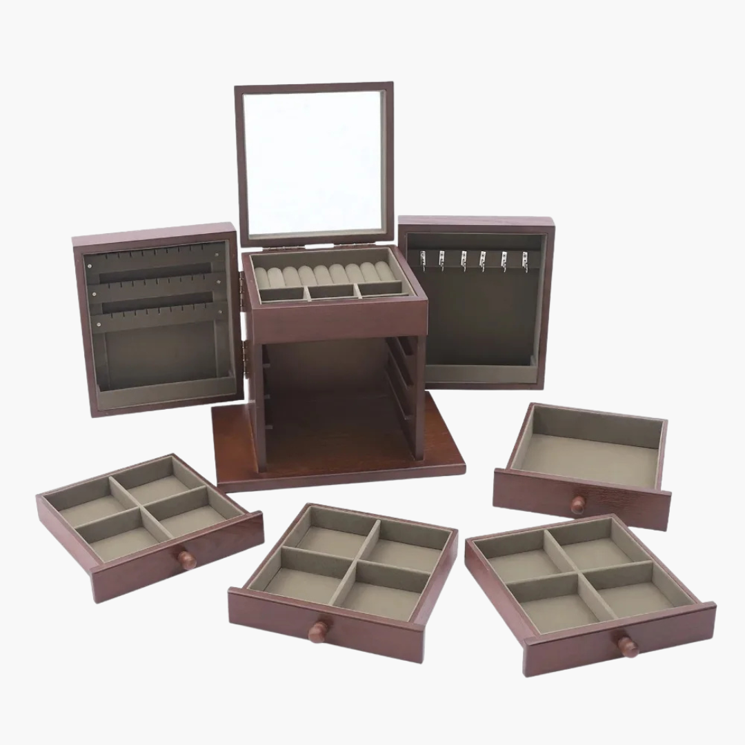 Chaque compartiment est pensé pour un usage intuitif et raffiné. Bagues, colliers, boucles d’oreilles et montres trouvent instantanément leur place. Grâce aux tiroirs coulissants et aux espaces modulables, vos bijoux restent visibles, protégés et accessibles en un clin d’œil.