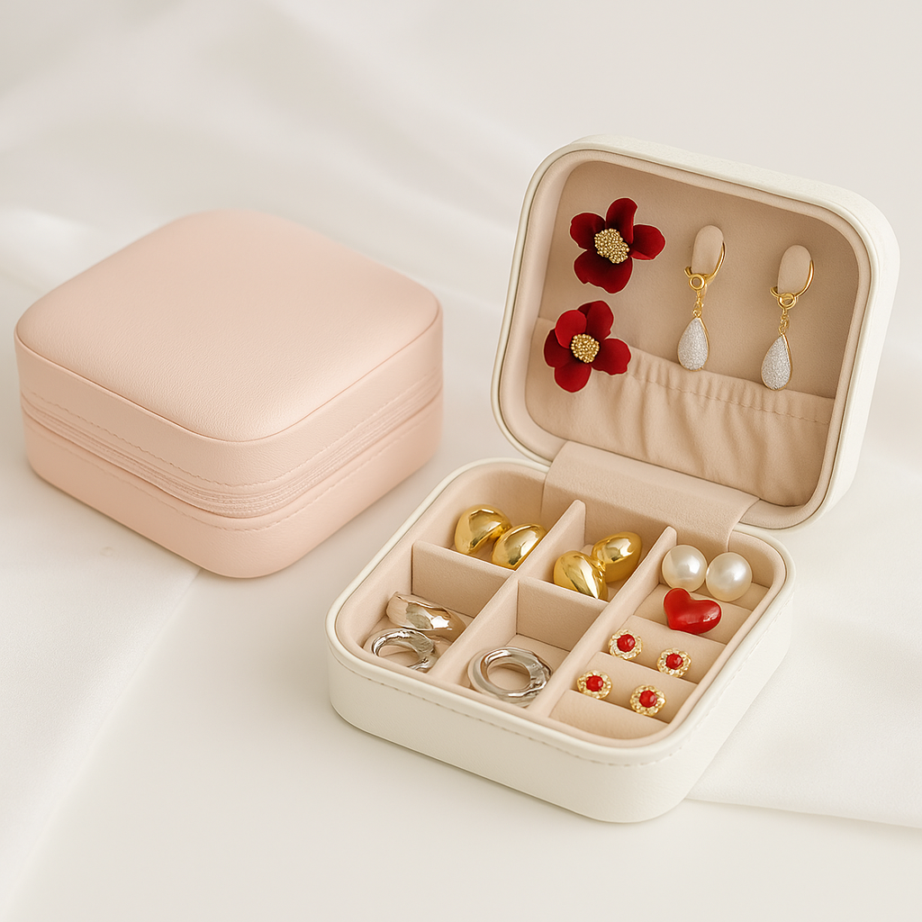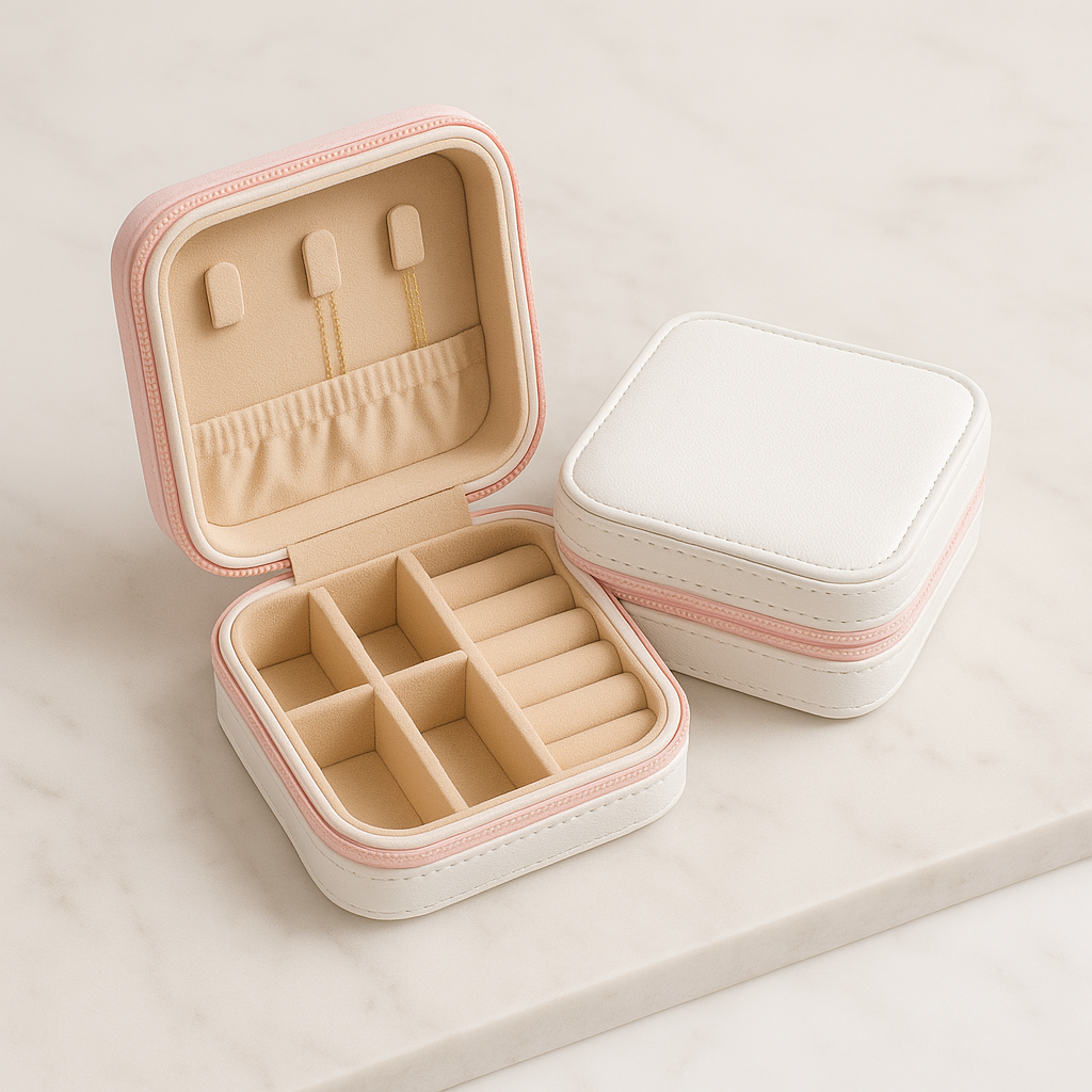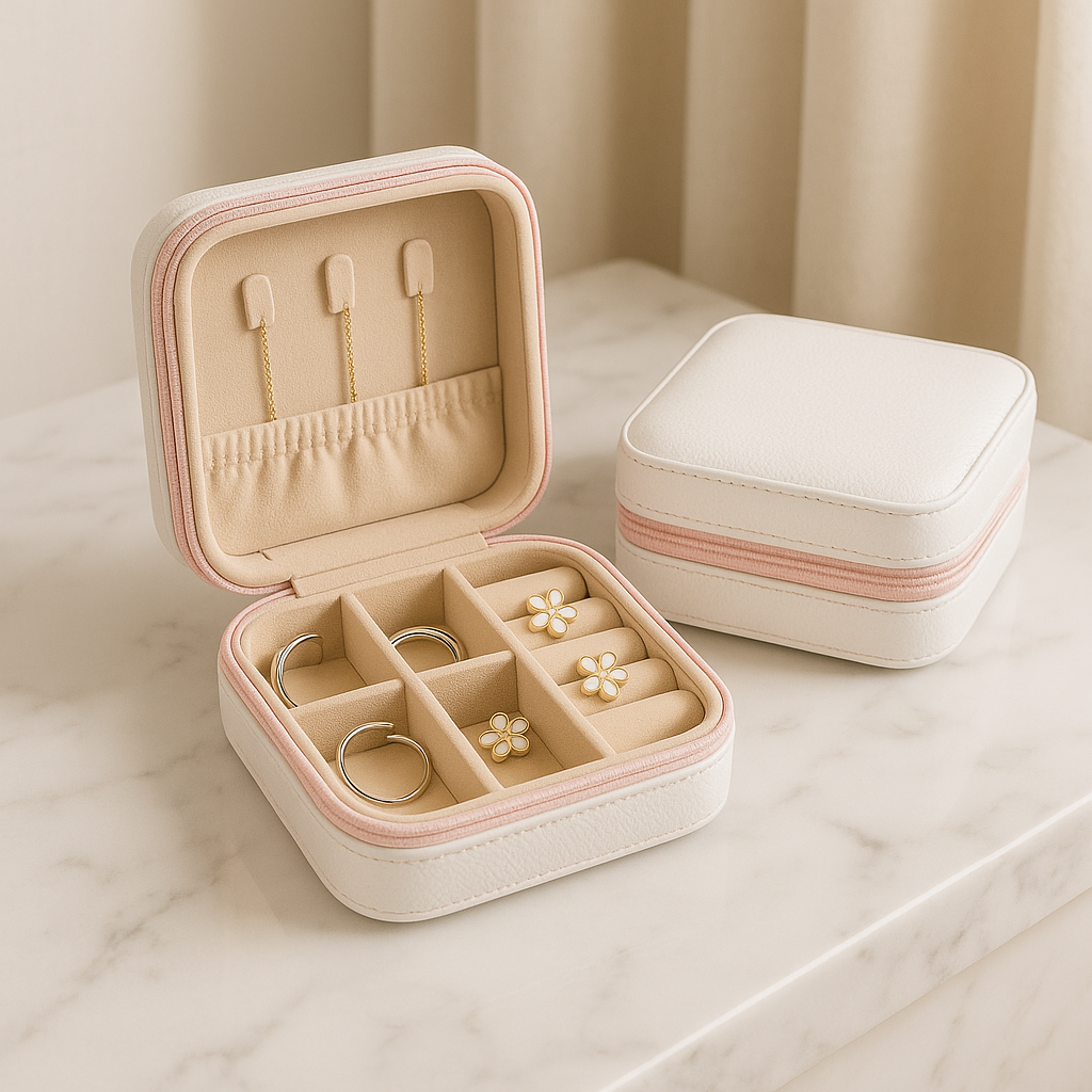 Sa forme compacte s’intègre parfaitement dans une chambre, sur une coiffeuse ou dans un tiroir. À la maison ou en déplacement, elle conserve vos bijoux à portée de main, sans jamais compromettre le style.