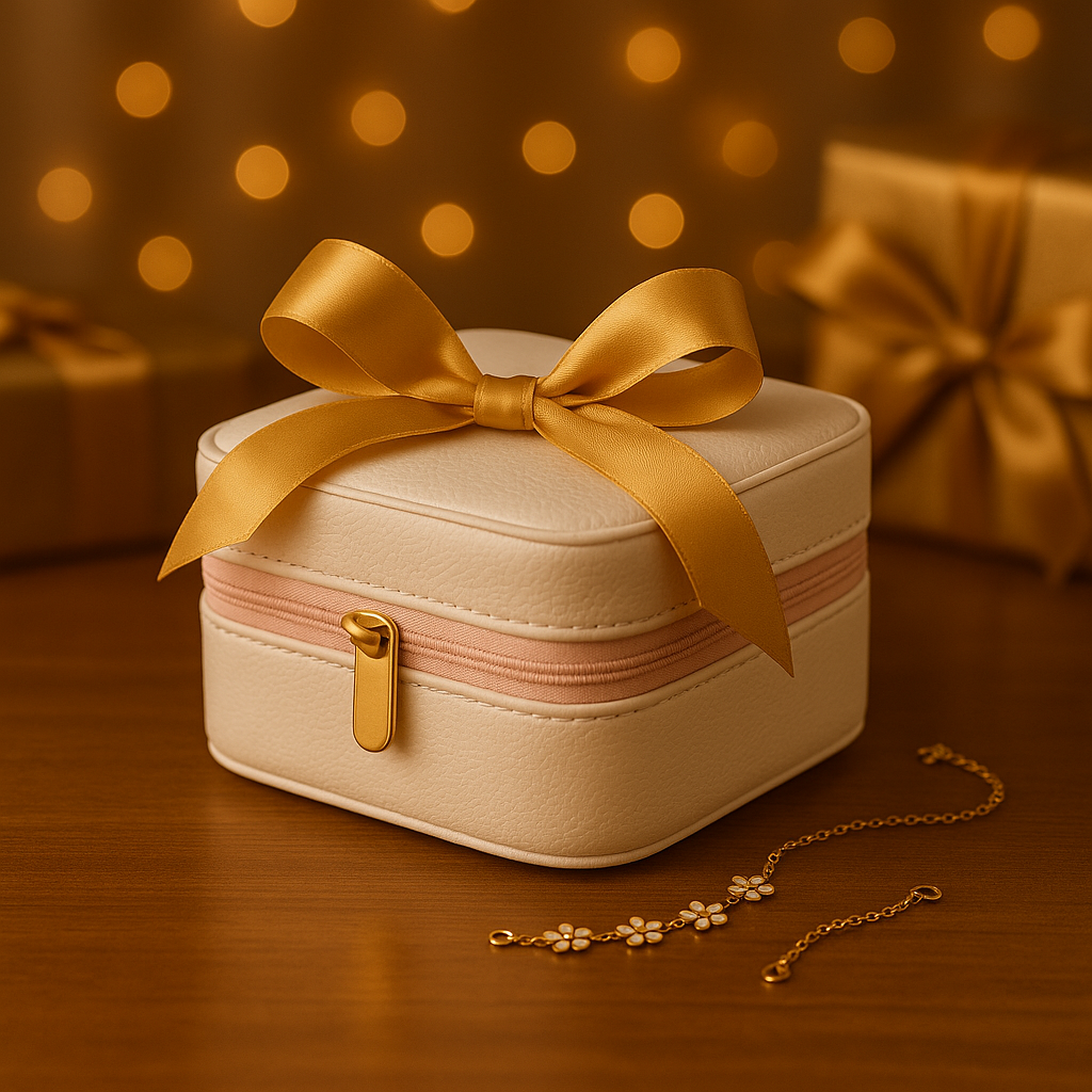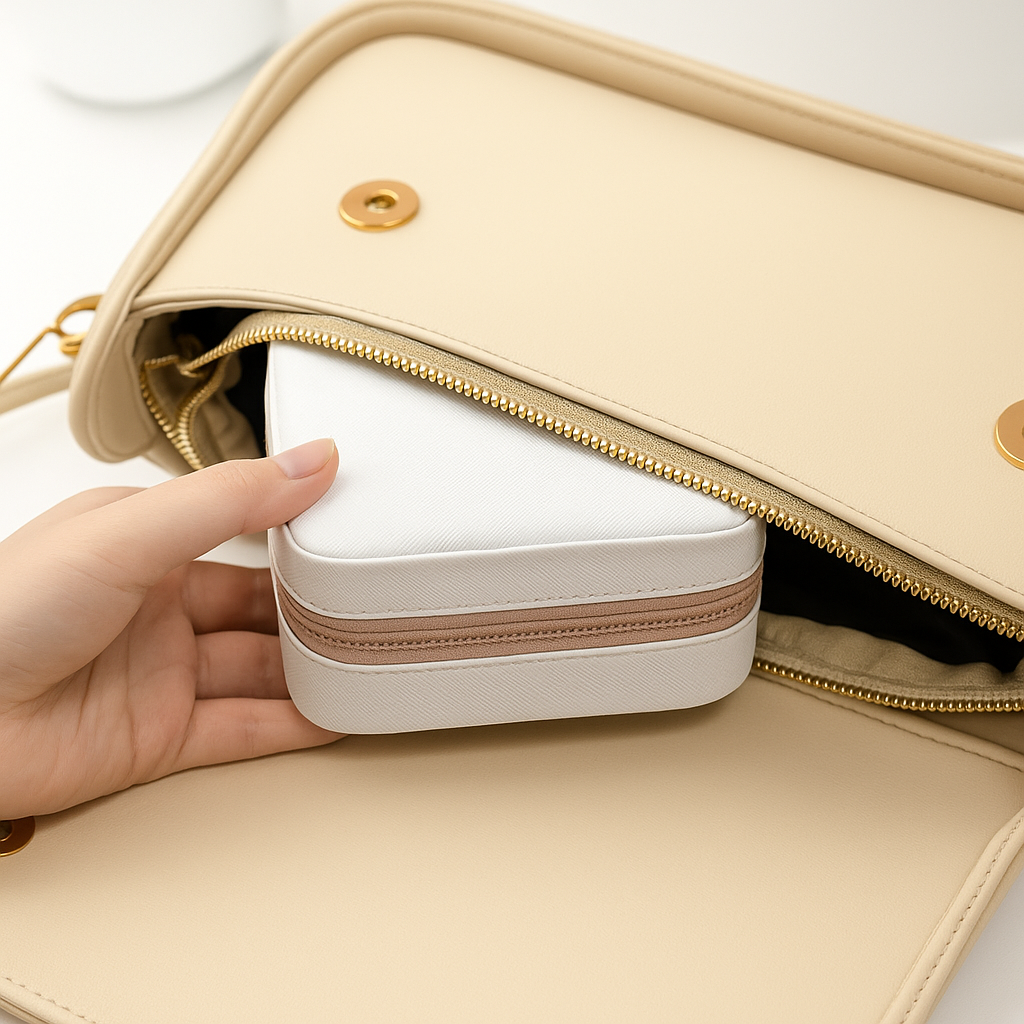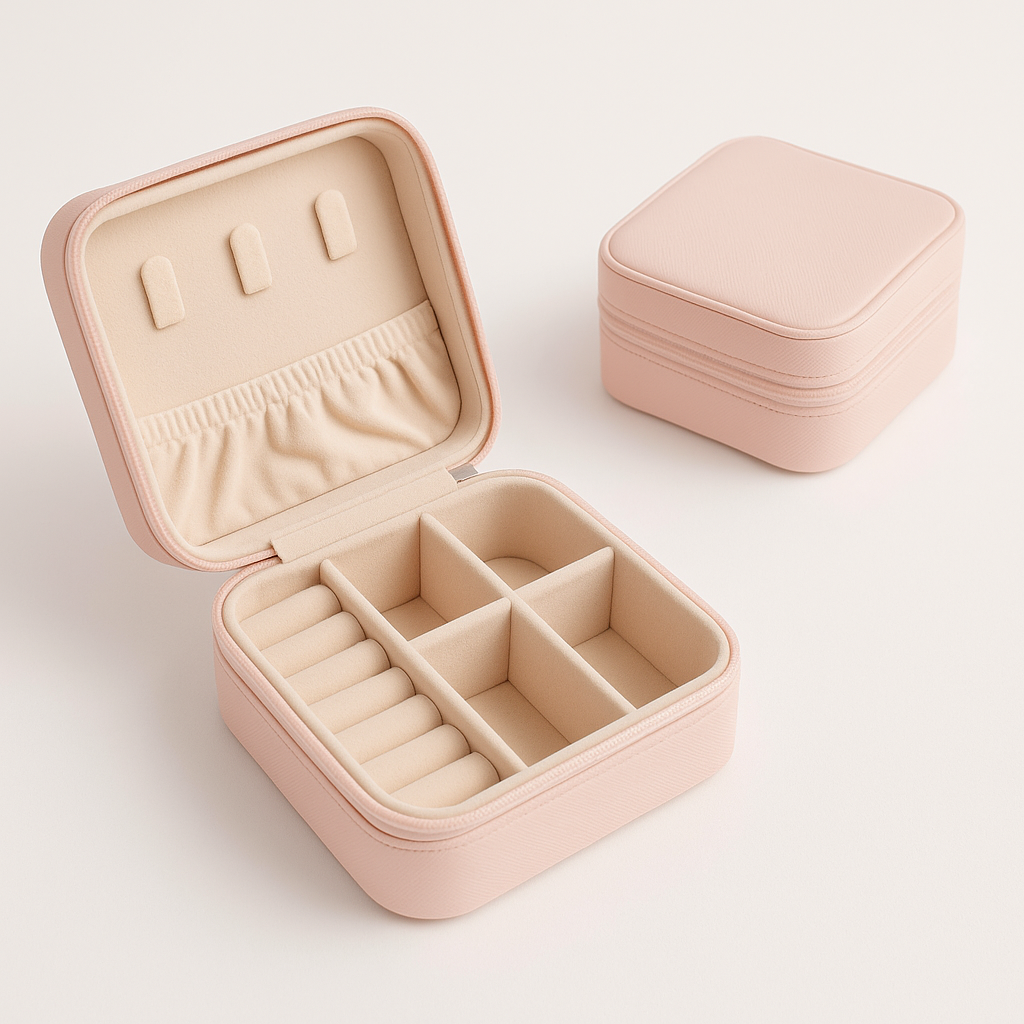Sa forme compacte s’intègre parfaitement dans une chambre, sur une coiffeuse ou dans un tiroir. À la maison ou en déplacement, elle conserve vos bijoux à portée de main, sans jamais compromettre le style.