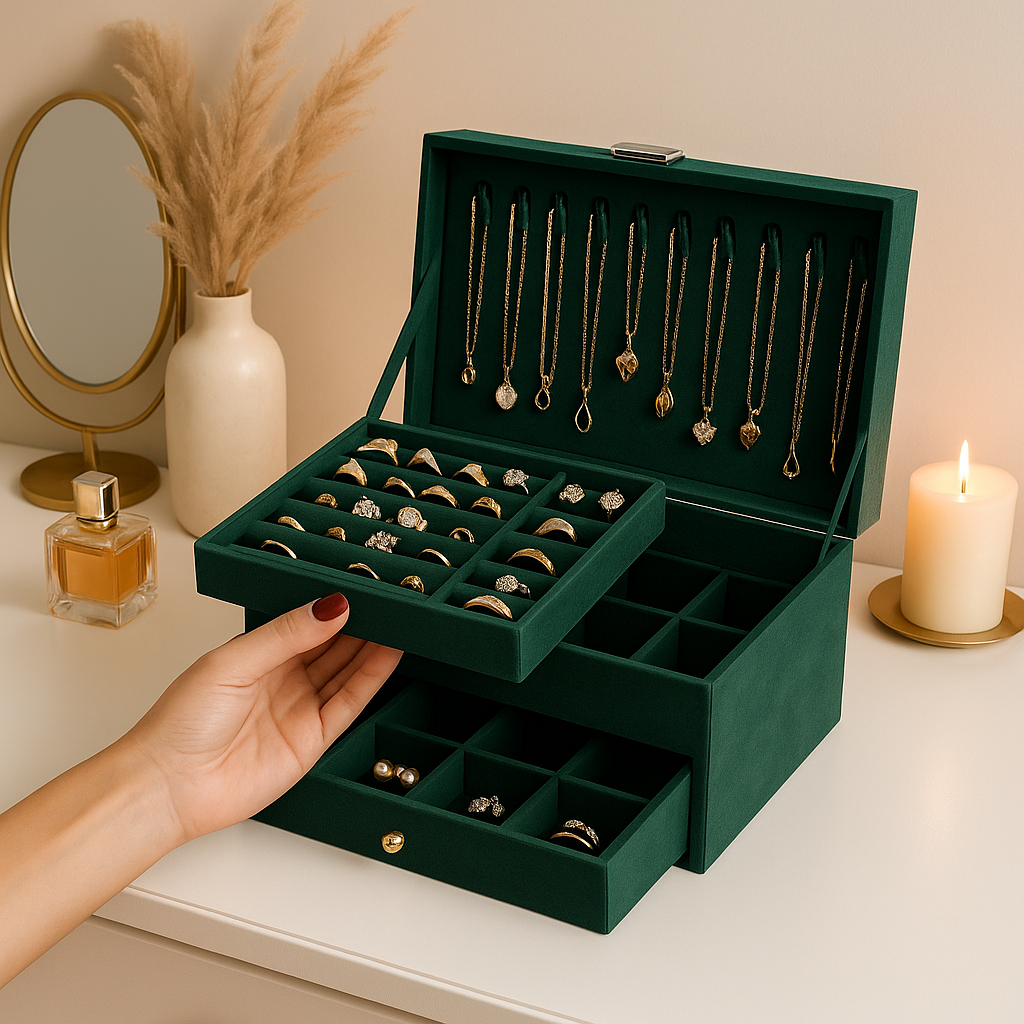 Et si l’élégance avait enfin trouvé sa place dans votre chambre ? Cette boîte à bijoux vert émeraude, à la fois douce et majestueuse, transforme le rangement quotidien en véritable rituel de beauté. Sur votre coiffeuse ou dans votre dressing, elle invite à l’ordre et au plaisir d’un geste simple, parfaitement orchestré.