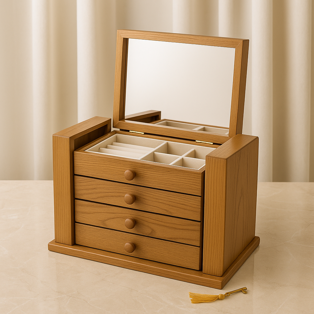 Dans l'intimité d'une chambre paisible, sur une coiffeuse baignée de lumière, cette boîte à bijoux devient le théâtre quotidien de vos plus beaux rituels. Chaque matin, elle vous accueille avec grâce, révélant vos trésors à portée de main. Élégante, organisée, inspirante — elle incarne l'art de vivre des femmes exigeantes.